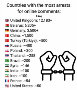 Смотрите на инфографику, которую я позаимствовал из одного статистического паблика в X — на картинке показано, сколько людей арестовывают за комменты в сети. Цифры немного кривые (думается мне, что речь не только о комментариях, а скорее об онлайн-активности в целом), но их порядок — плюс-минус адекватный действительности. Подумайте как будете парировать аргументы прокурора, если он поделится с судьей этой статистикой